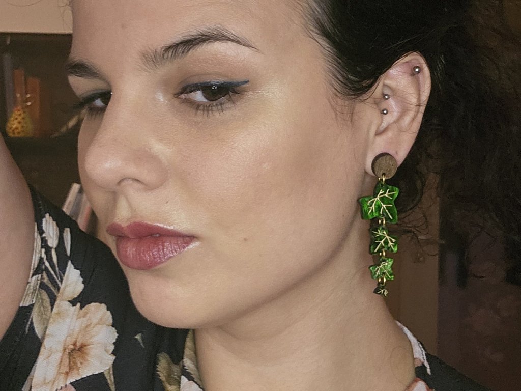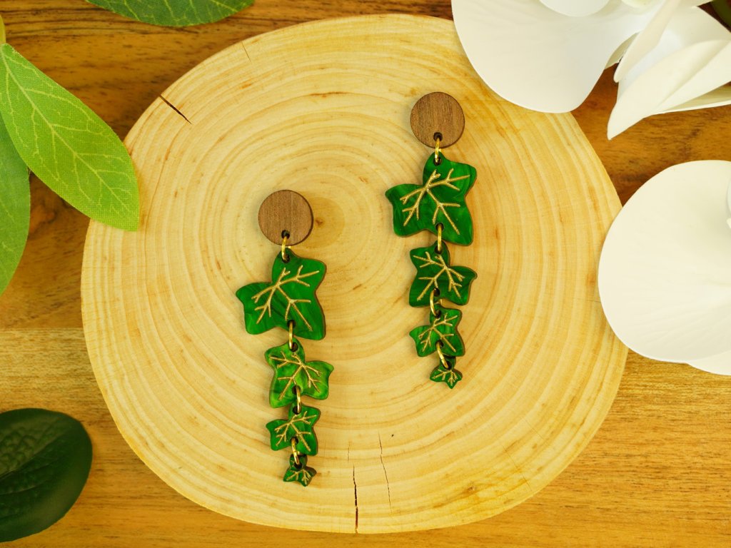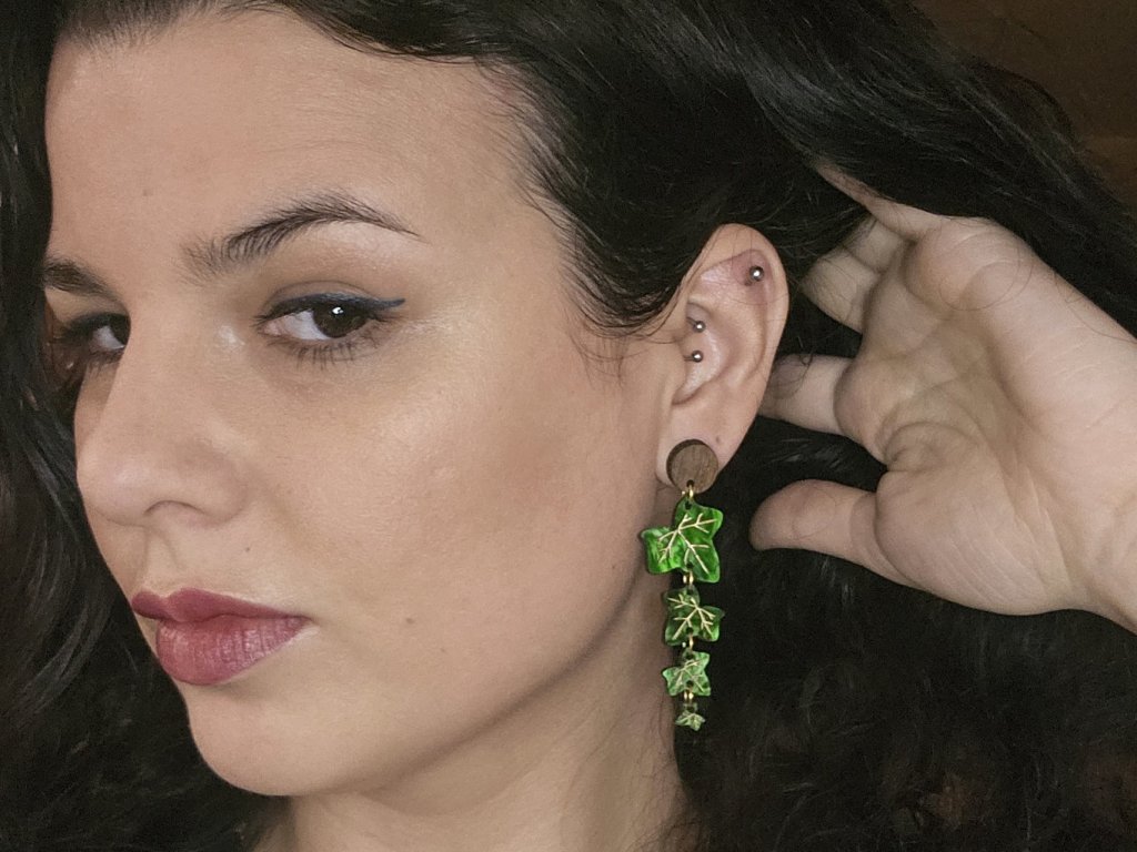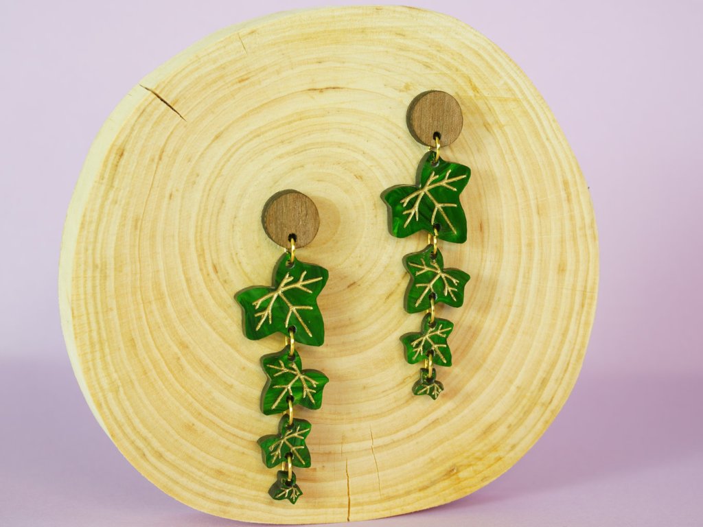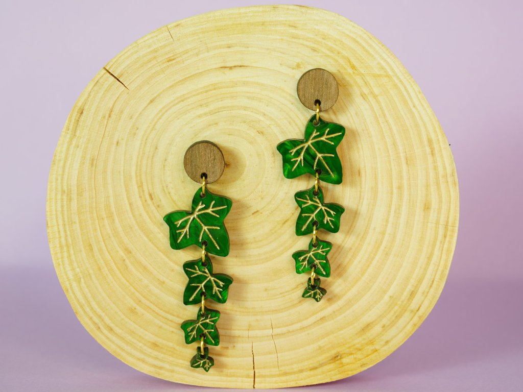 Lehké autorské náušnice inspirované strukturou listu Břečťanu. Ručně malované zlaté detaily dodávají šperku hravost i eleganci. Kombinace šperkařského akrylu s dřevěnou puzetou tvoří unikátní celek. Ideální pro milovníky přírody a výrazných šperků.