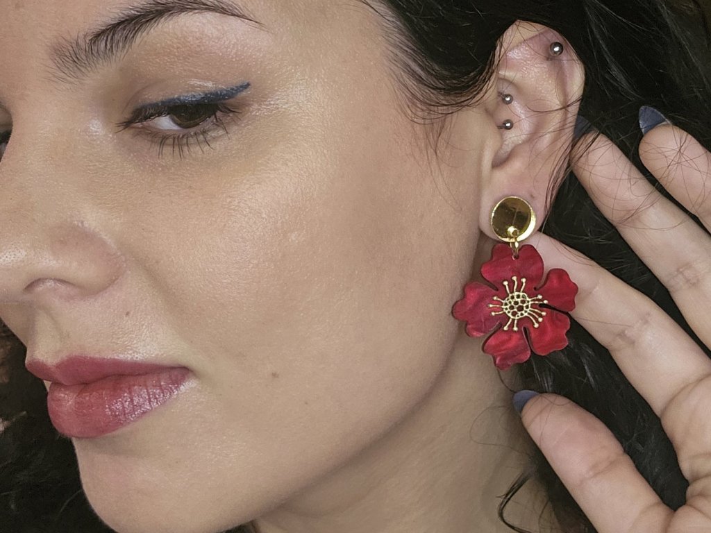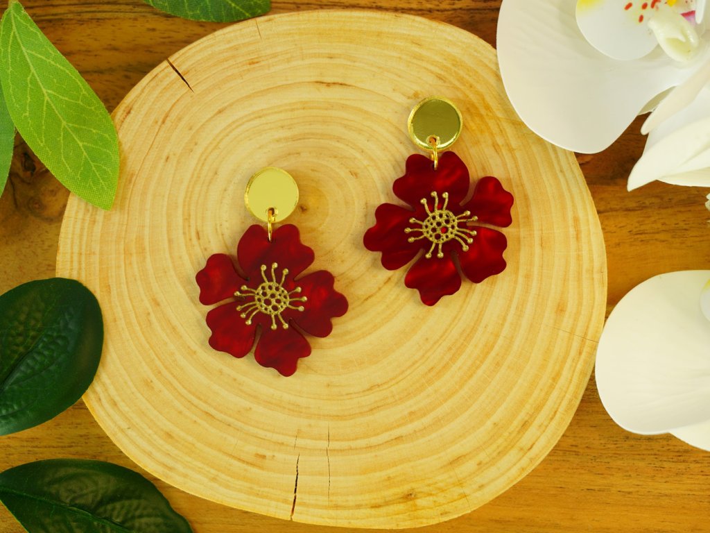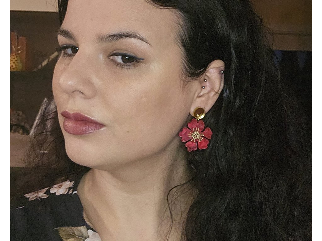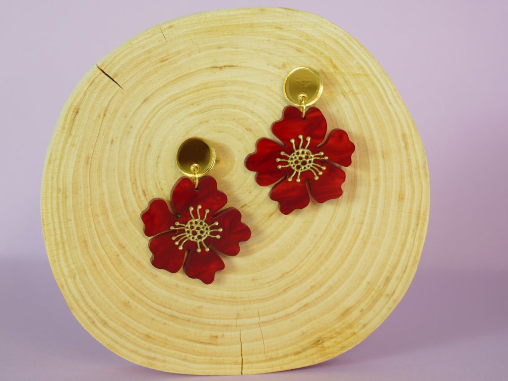 Červené akrylové náušnice ve tvaru květu se zlatým středem. Zlaté zrcadlové puzety přidají náušnicím na eleganci. Výrazný doplněk, který rozzáří každý outfit a dodá mu ženský nádech. Ideální pro milovníky přírody a výrazných šperků.