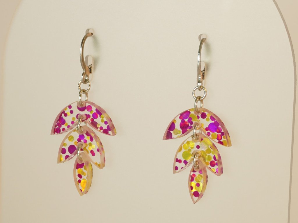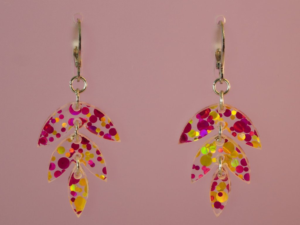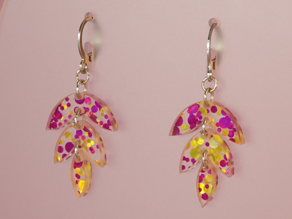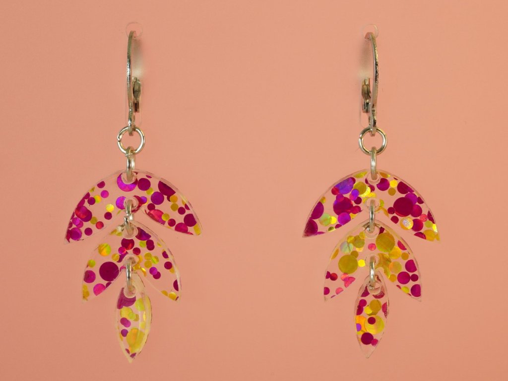 Stylové visací náušnice vyrobené z akrylových dílků ve tvaru listu. Tento originální doplněk v růžovozlatém provedení se skvěle hodí ke každému outfitu – od každodenního nošení až po večerní setkání.