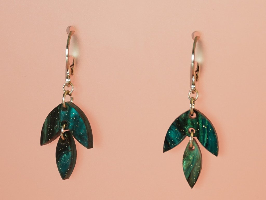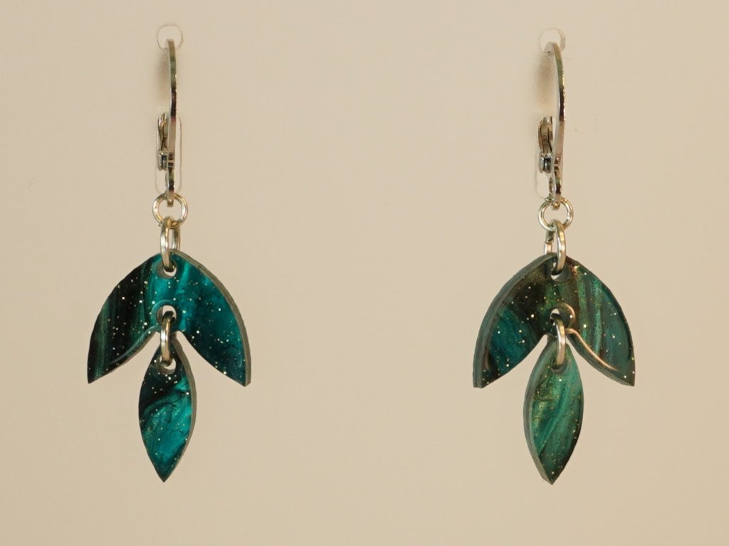 Stylové visací náušnice vyrobené z akrylových dílků ve tvaru listu. Tento originální doplněk v zeleném provedení se skvěle hodí ke každému outfitu – od každodenního nošení až po večerní setkání.