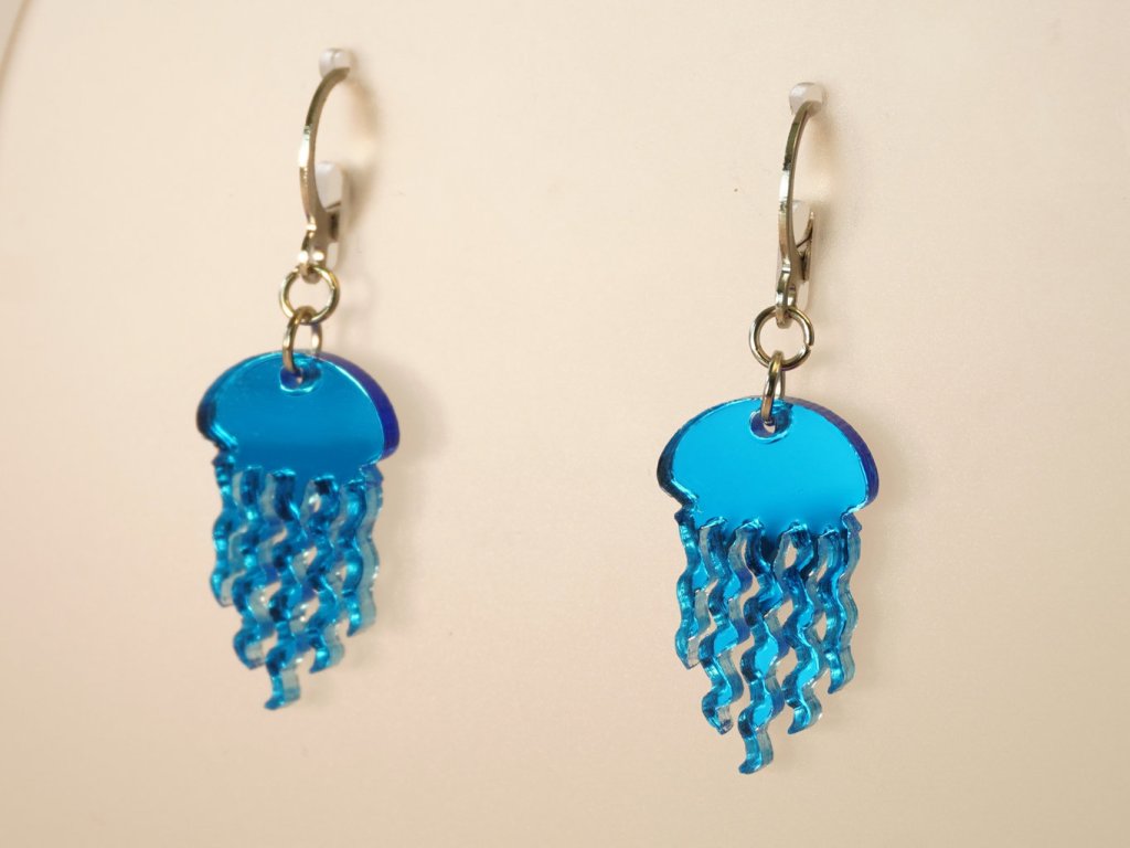 Stylové visací náušnice ve tvaru hravých medúz, vyrobené z modrého zrcadlového akrylu. Díky lehkému materiálu jsou náušnice pohodlné na nošení po celý den, a přitom zůstávají výrazným designovým doplňkem.