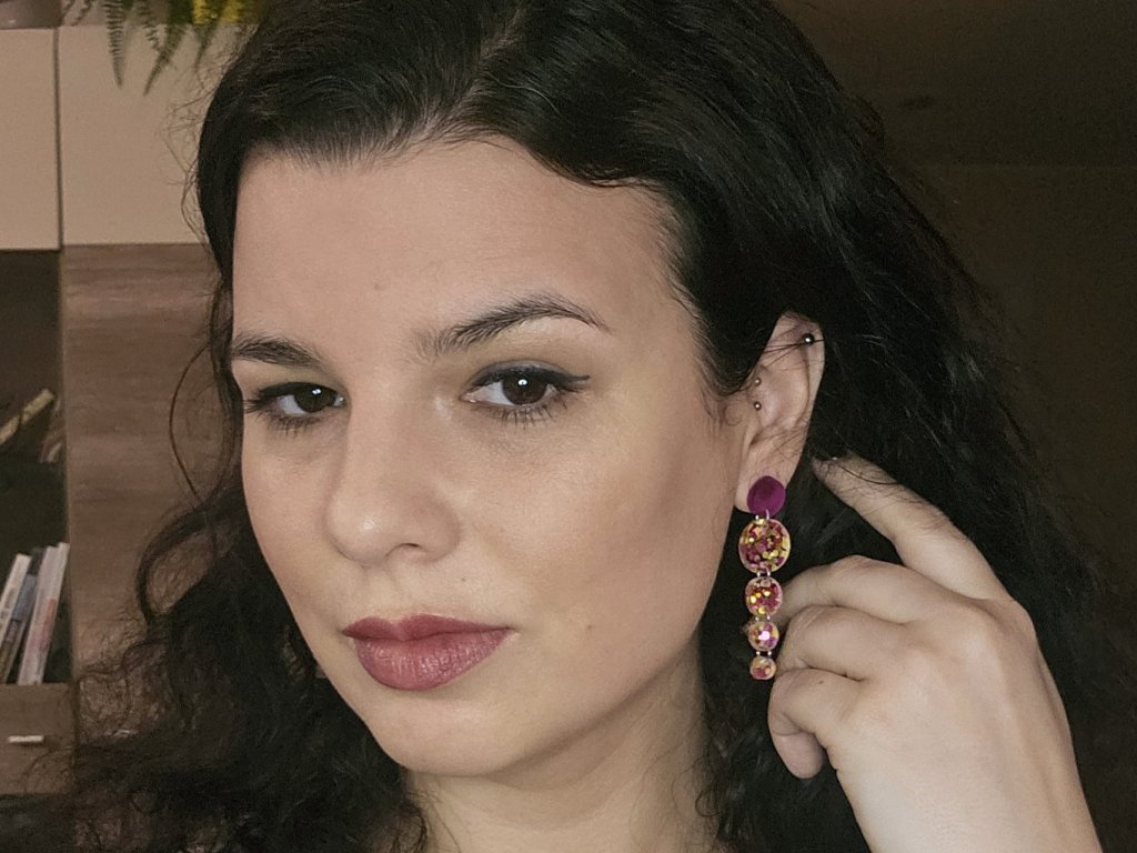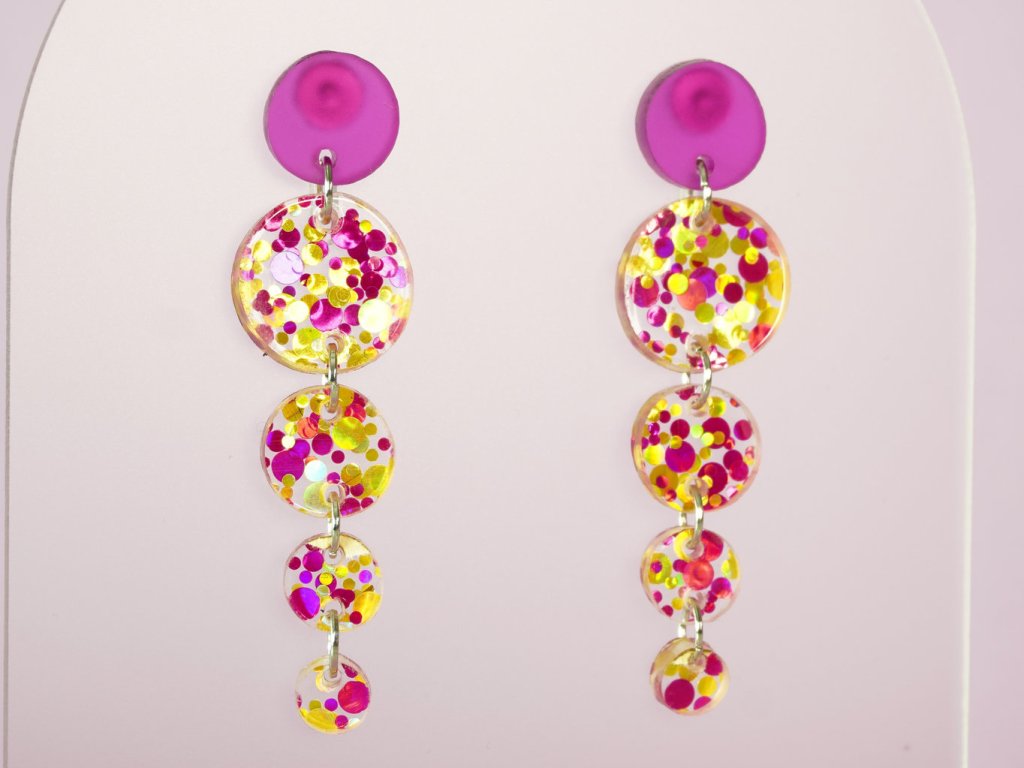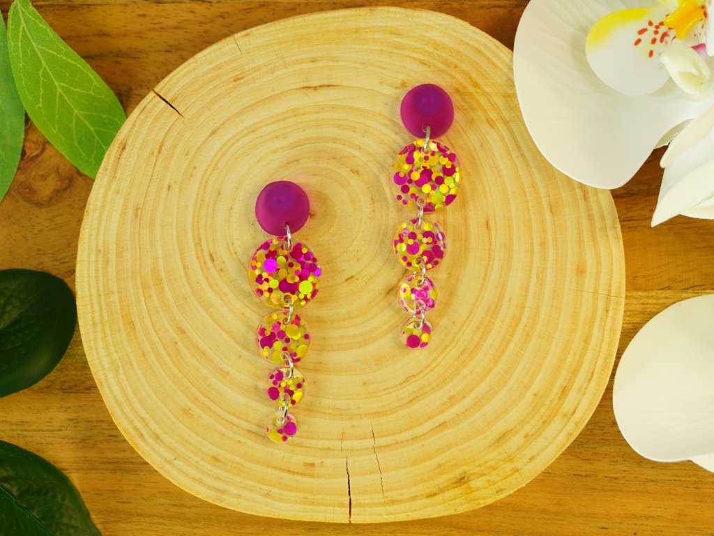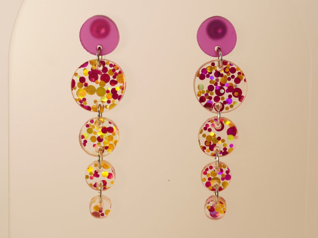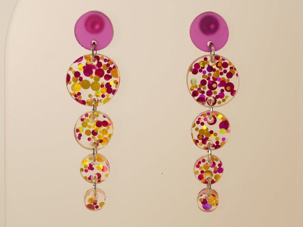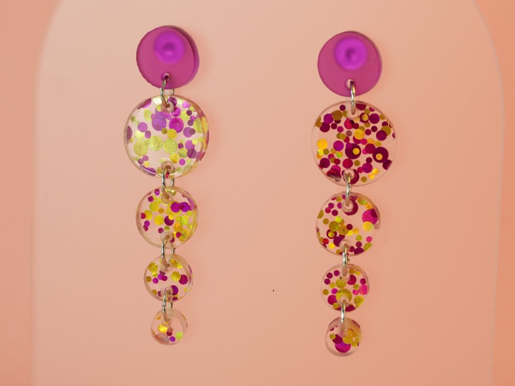 Stylové visací náušnice vyrobené z akrylových dílků připomínajících řekou ohlazené kamínky. Tento originální doplněk v růžovozlatém provedení se skvěle hodí ke každému outfitu – od každodenního nošení až po večerní setkání.
