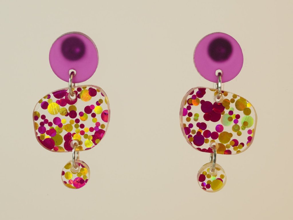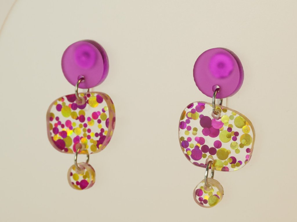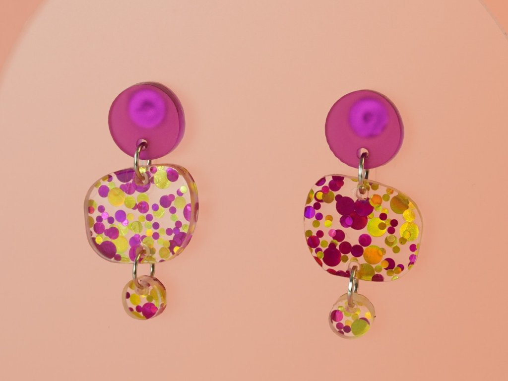 Stylové visací náušnice vyrobené z akrylových dílků připomínajících řekou ohlazené kamínky. Tento originální doplněk v růžovozlatém provedení se skvěle hodí ke každému outfitu – od každodenního nošení až po večerní setkání.