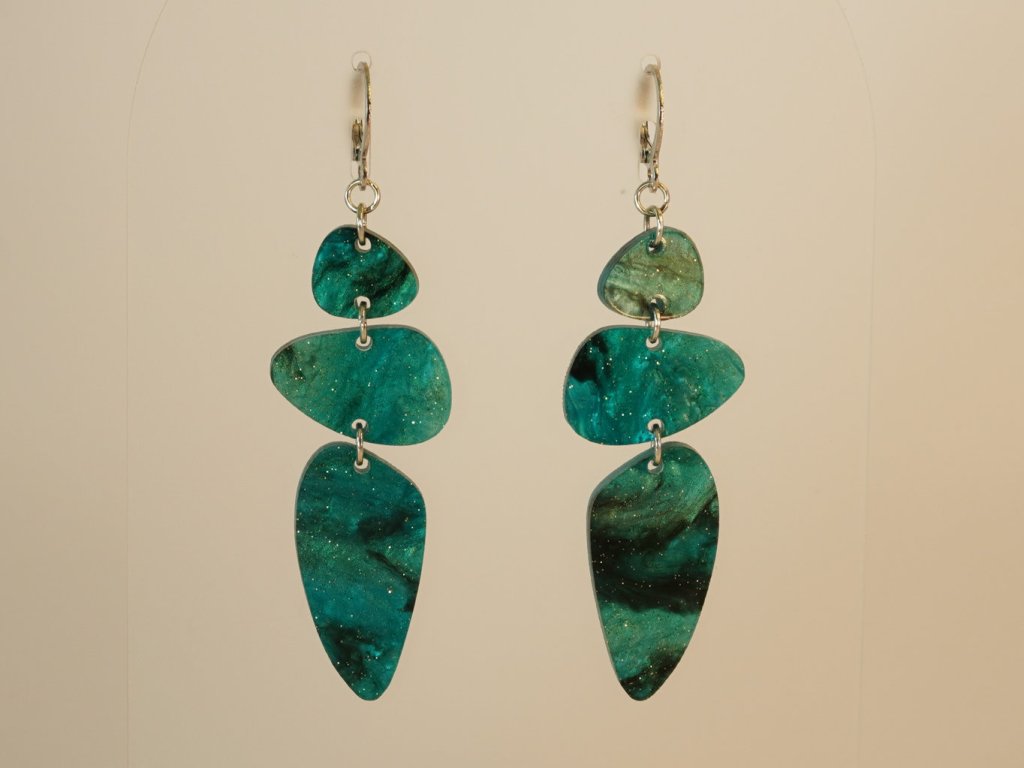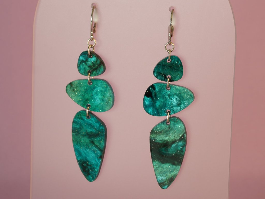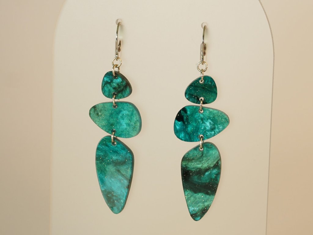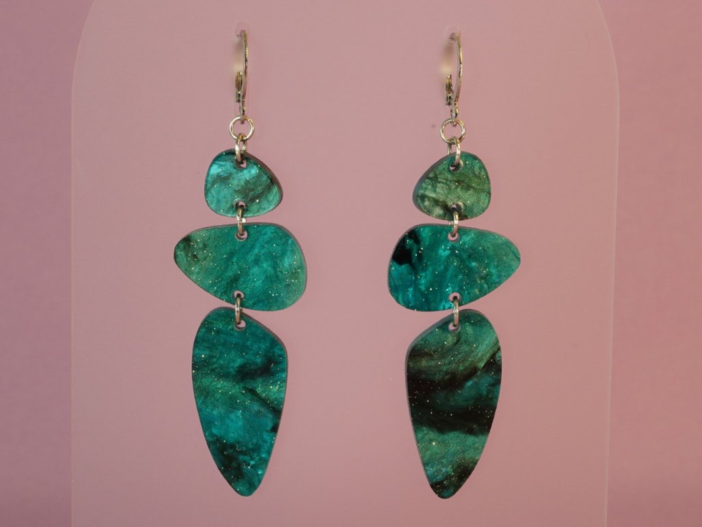 Stylové visací náušnice vyrobené z akrylových dílků připomínajících řekou ohlazené kamínky. Tento originální doplněk v zeleném provedení se skvěle hodí ke každému outfitu – od každodenního nošení až po večerní setkání.