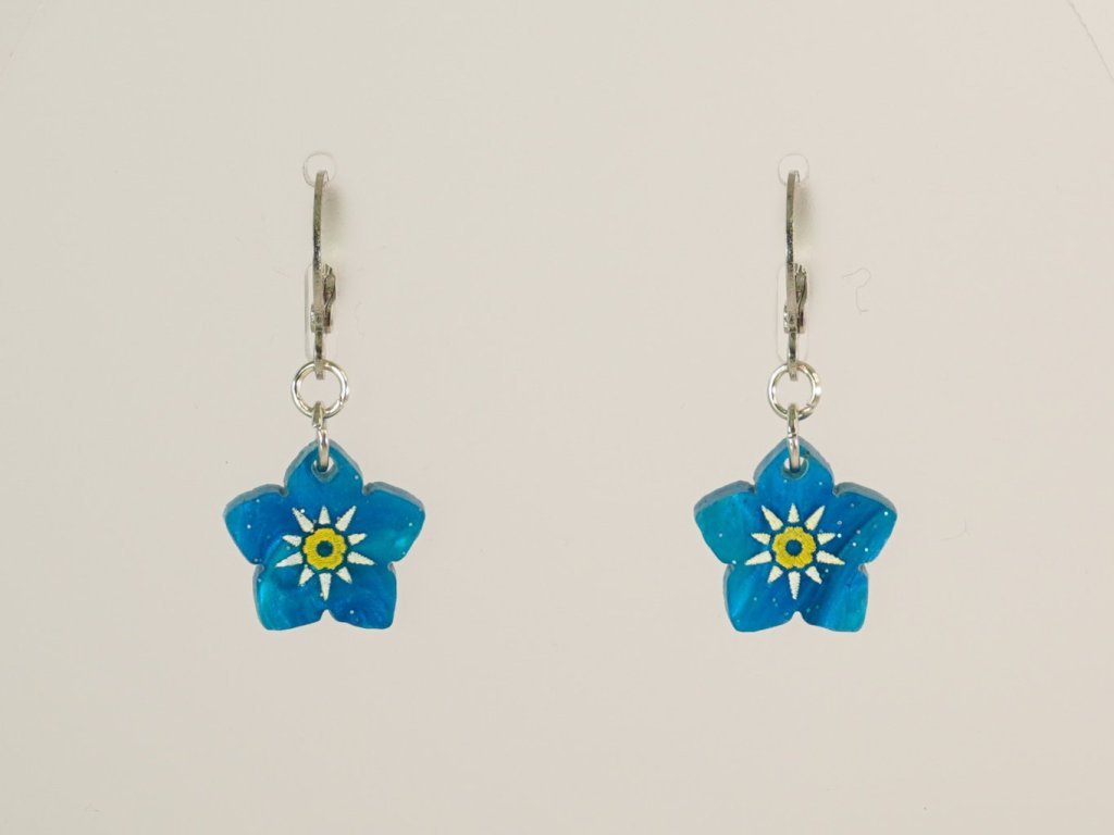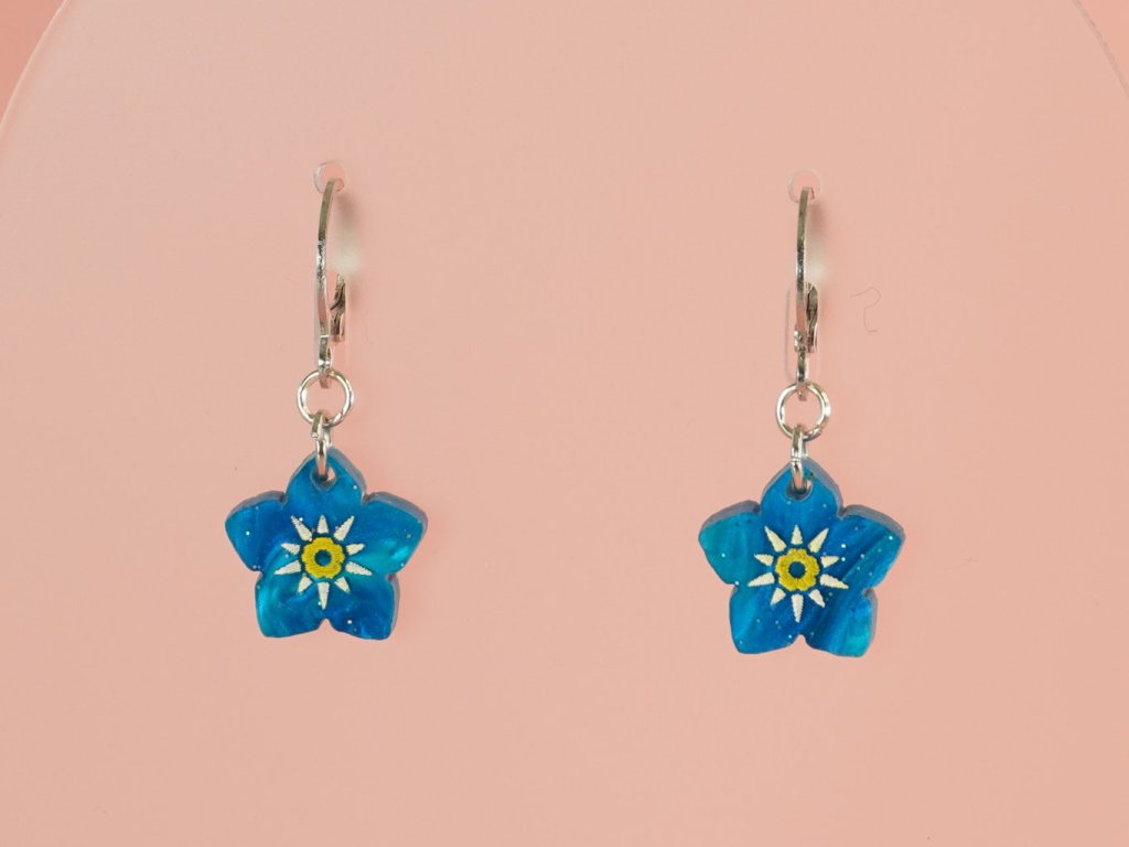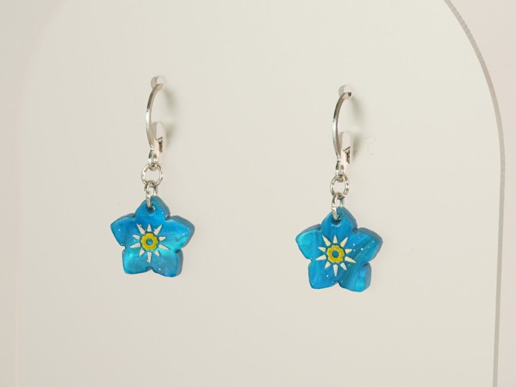 Jemné modré kytičky pro velké i malé milovnice náušnic. Jsou vyrobeny ze speciálního šperkařského akrylu, ve kterém se prolínají různé odstíny modré barvy se třpytkama. Díky tomu je každý pár unikát, který budete mít pouze vy.