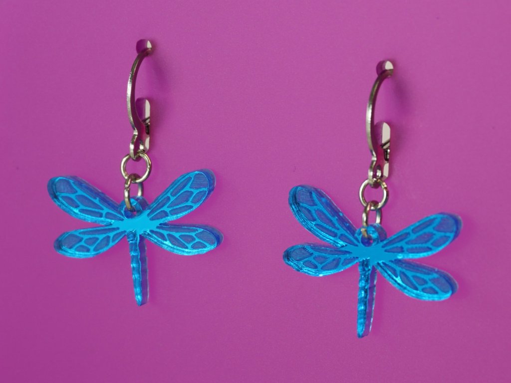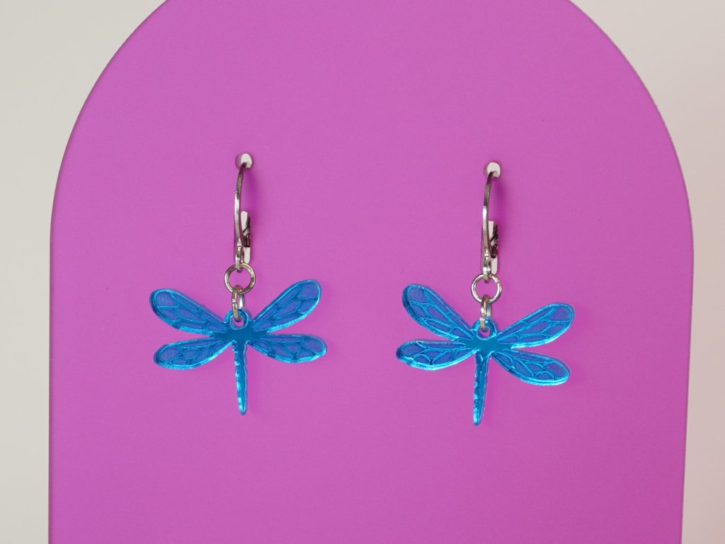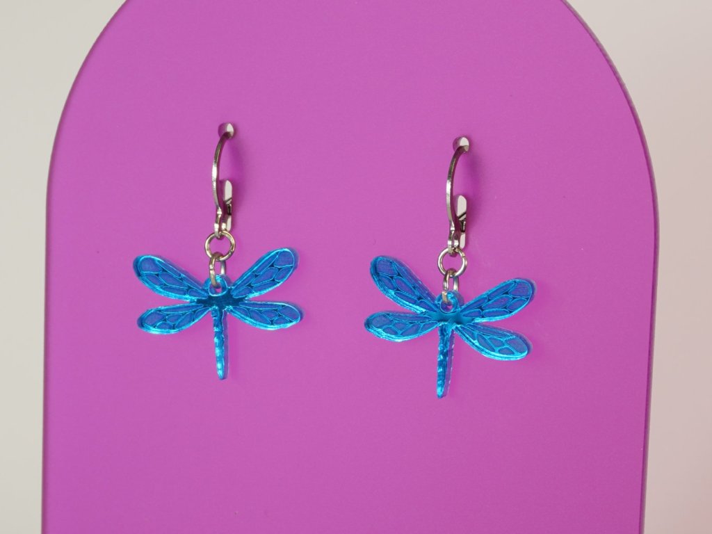 Stylové visací náušnice ve tvaru hravých vážek, vyrobené z modrého zrcadlového akrylu. Díky lehkému materiálu jsou náušnice pohodlné na nošení po celý den, a přitom zůstávají výrazným designovým doplňkem.